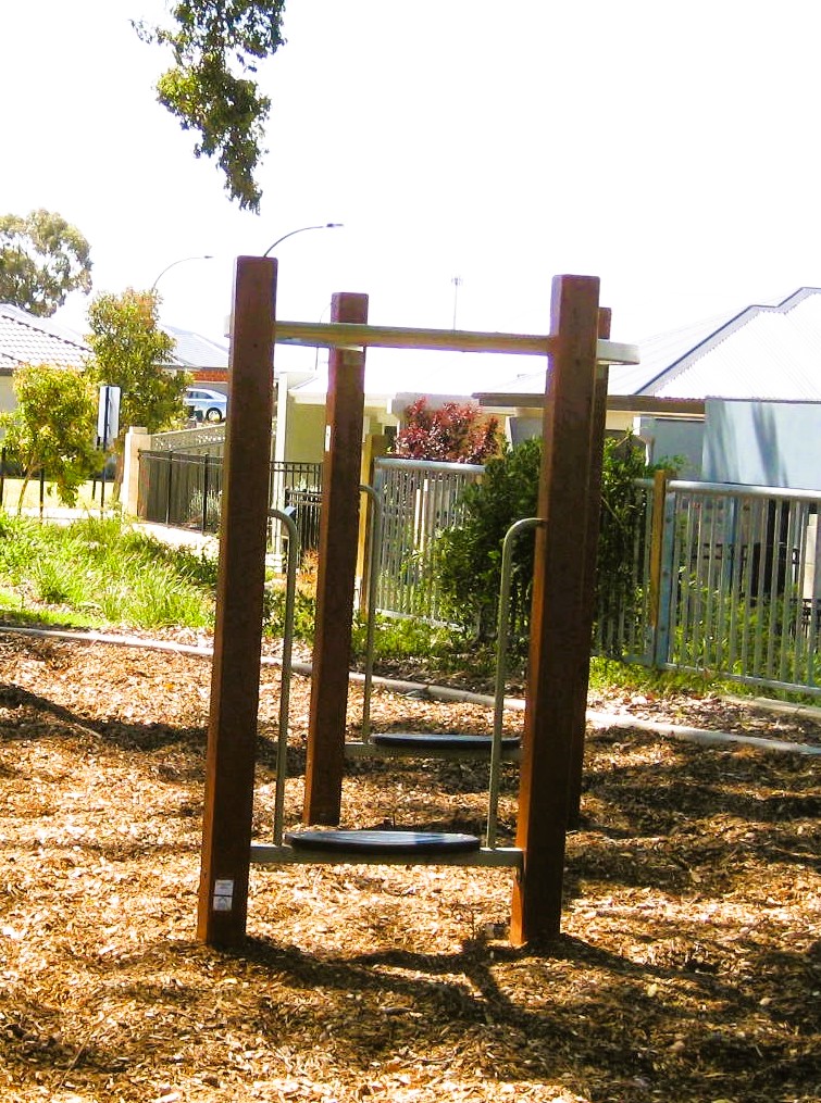 This small local playground in suburban Wellard is set amongst mature shady trees. The play areas are built around existing tree trunks, logs and rocks interspersed with metal cubby frames, tyres, concrete tunnels and softfall.