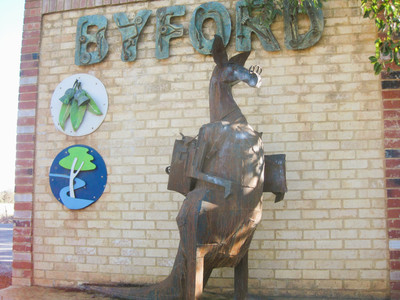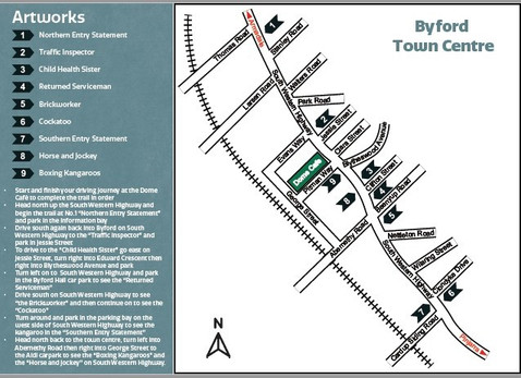The other sculptures are all within the town centre with the greatest distance just over 1km in one direction. A great starting point is Dome Cafe which has the Boxing Kangaroos. A little further south along South Western Highway is the Horse and Jockey acknowledging Byford's 1919 Perth Cup champion Rivose. The plinth includes original bricks from the State Brickworks.. ro