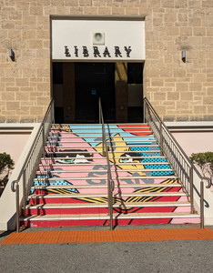 From Neil Hawkins hike up the hill along Boas Avenue. At the Lakeside Drive roundabout you will see a beautiful flame tree and a statement artwork. Cross over to the Library and enjoy the murals covering the paths and staircases and the artworks by Anya at the entrance. Be sure to check the bronze plaques on the pillars and the artwork on the outside of the building.