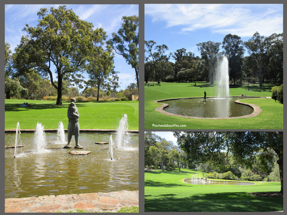 The bronze statue of mother and child in her arms stands on two stepping stones in a pond surrounded by fountains. Connected to the water garden with it's tumbling stream and tranquil ponds by winding paths and wooden footbridges the Pioneer Womens Memorial anchors these gardens designed by architect Geoffrey Summerhayes. The lawns overlooking the Pioneer Womens Memorial are the location for many events including outdoor concerts.