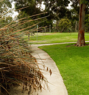 As you approach Blue Lake Park you come to a living stream area. Kids have built a little dirt bike track here. The stream is covered in massive reeds and surrounded by large blocks at different levels - an invitation to step and climb.