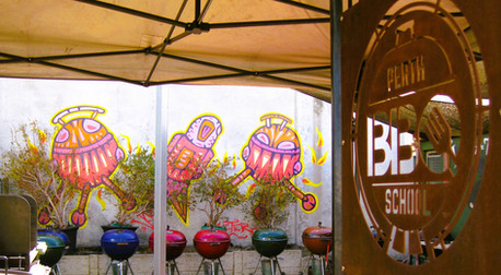 Exploring the alley way beside the Perth BBQ School at 195 Guildford Road we discovered some more art including a Darry Perier mural on Sullivan Lane and a magnificent mural paying tribute to some giants of the music industry on Greenslade Lane.