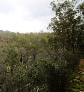 The trail follows alongside a vehicle track before crossing a creek. Here, after sharing just over 4km with the Quenda Circuit, the Numbat Trail peels off to the right for a 5.4km tadpole loop. If you were considering hiking the Numbat Trail this is a good point to re-assess! The Quenda Circuit continues on, climbing steeply via a series of switchbacks. There is a marked 100m side trail to the John Forrest Cairn Monument. This cairn was built in 1879 during the original survey trip through the valley. Hiking through this pristine bush environment one has to wonder what those early explorers were thinking!