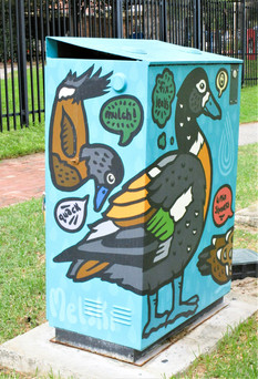 At Dane Street we enjoyed the bubbles on the Laundromat and decided to continue along Albany Highway. We saw a few pieces of public art including Time Out - three unique friendly guardians on banner posts guarding the cafe precinct and Gateaux and Spoon - locally known as the Cake Bin - a rubbish bin decorated as a colourful piece of cake in a nod to the area's coffee culture.