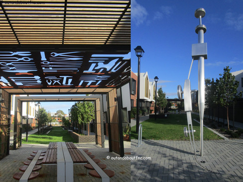 While wandering around the Watershed we glimpsed a sculpture to the east so we headed along the walkway to Greenwood Lane and then turned left coming to Mercator Lane and Cartography Lane which feature a central green strip with giant artworks by Peter McMeikan featuring a drafting pen and a compass at either end and a lovely arbor decorated with cut outs of trade tools and equipment, reflecting the technical equipment used at the Wembley Technical College which was located here. These artworks were installed in 2023 and do not feature on the Subi Centro walk trail but can easily be added on as a detour.