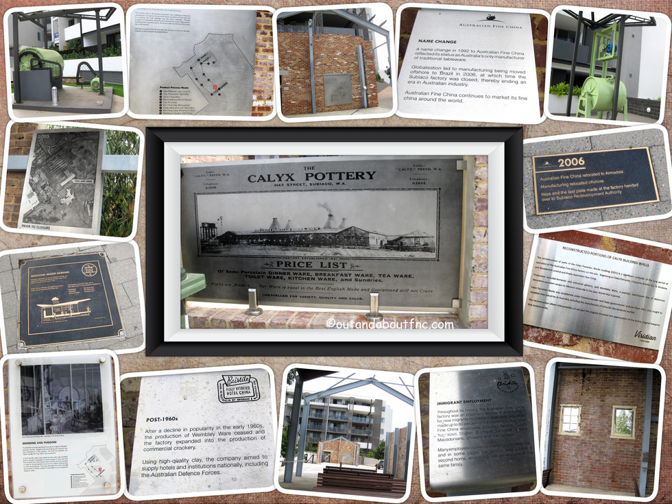Before redevelopment, the entries to several factories were situated close to the Hay Street subway. These included Alroh Turf Machinery and Australian Fine China, which began as Calyx Pottery in 1921. The factory was staffed by experienced potters from England. In 1941 it was leased by Brisbane and Wunderlich who later owned the business and traded as Bristile. The production of industrial porcelain goods and the supply of china to the hospital and hotel sector was augmented by a now famous line of ornamental gift china called Wembley Ware, produced from 1946 to 1961. The pedestrian underpass connecting Hay Street with Jolimont Park bears stunning murals reflecting Australian Fine China and Wembley Ware.